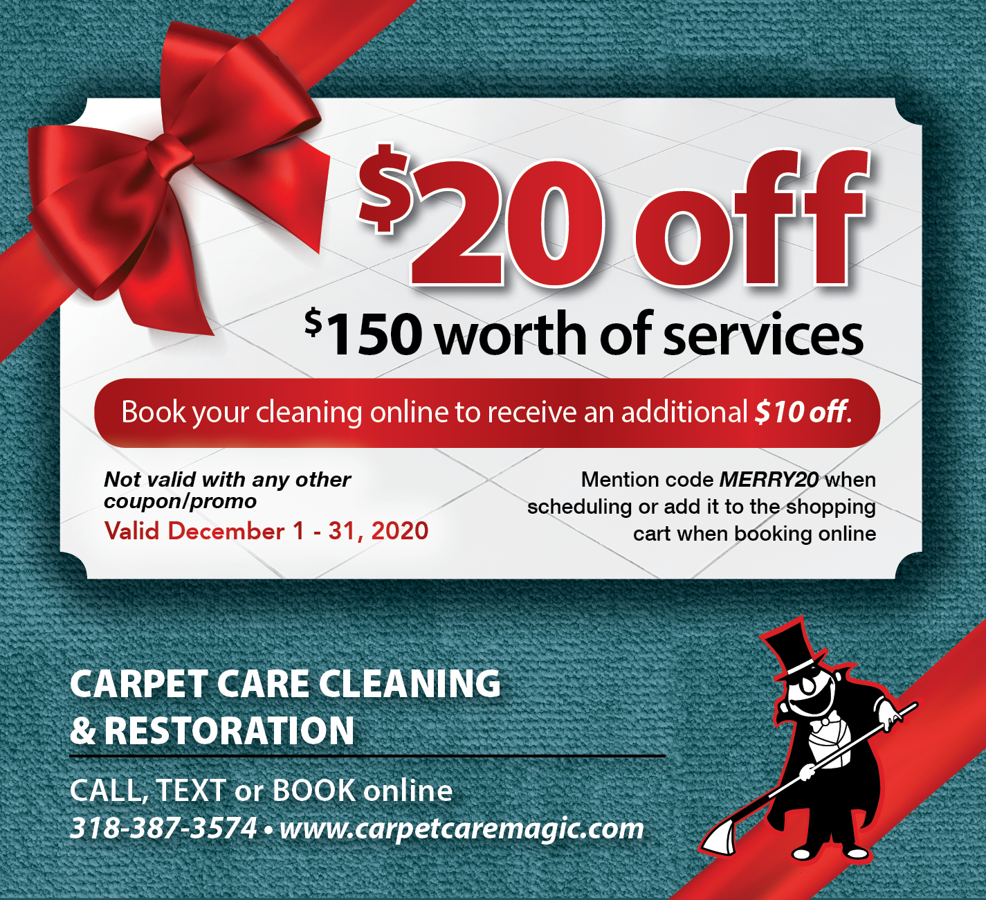 Book your cleaning online to receive an additional $10 off.